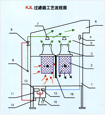 过滤过程:在压缩机吸气负压作用下,KJL吸入周围的环境空气,当空气穿过高效过滤筒时,粉尘由于重力、静电、接触被阻留在滤筒外表面,净化空气进入净气室然后由出风管送出。